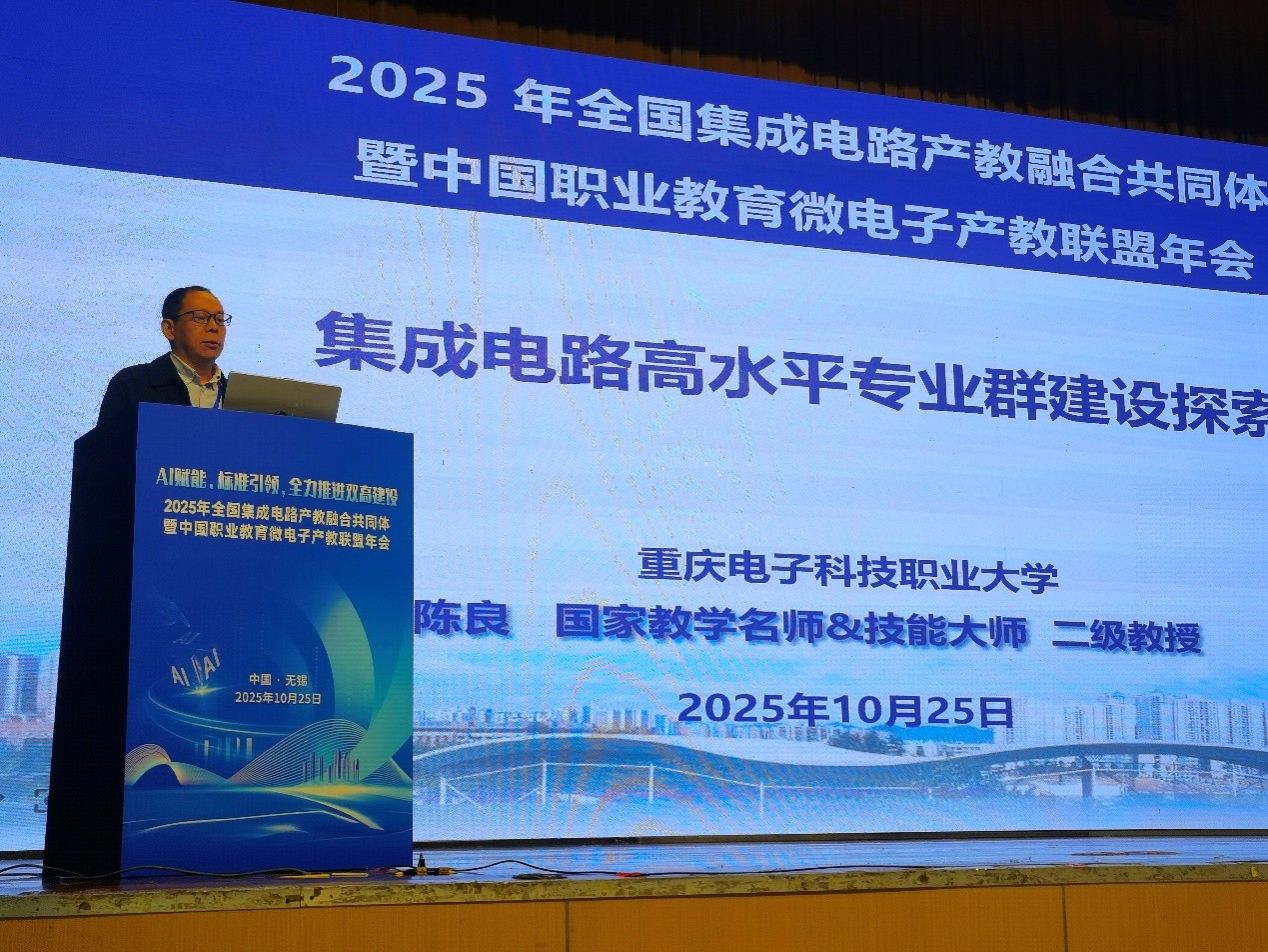 2025年10月25日,重庆电子科技职业大学电子与物联网学院(集成电路学院)党总支书记陈良(二级)教授受邀出席在江苏无锡举办的2025年全国集成电路产教融合共同体工作会议暨中国职业教育微电子产教联盟年会,集成电路系副主任林涛教授陪同参会。本次会议以“AI赋能、标准引领,全力推进双高建设”为主题,汇聚了全国30余家企业代表、50余所院校代表,共同探讨集成电路产教融合与高水平专业群建设路径。
