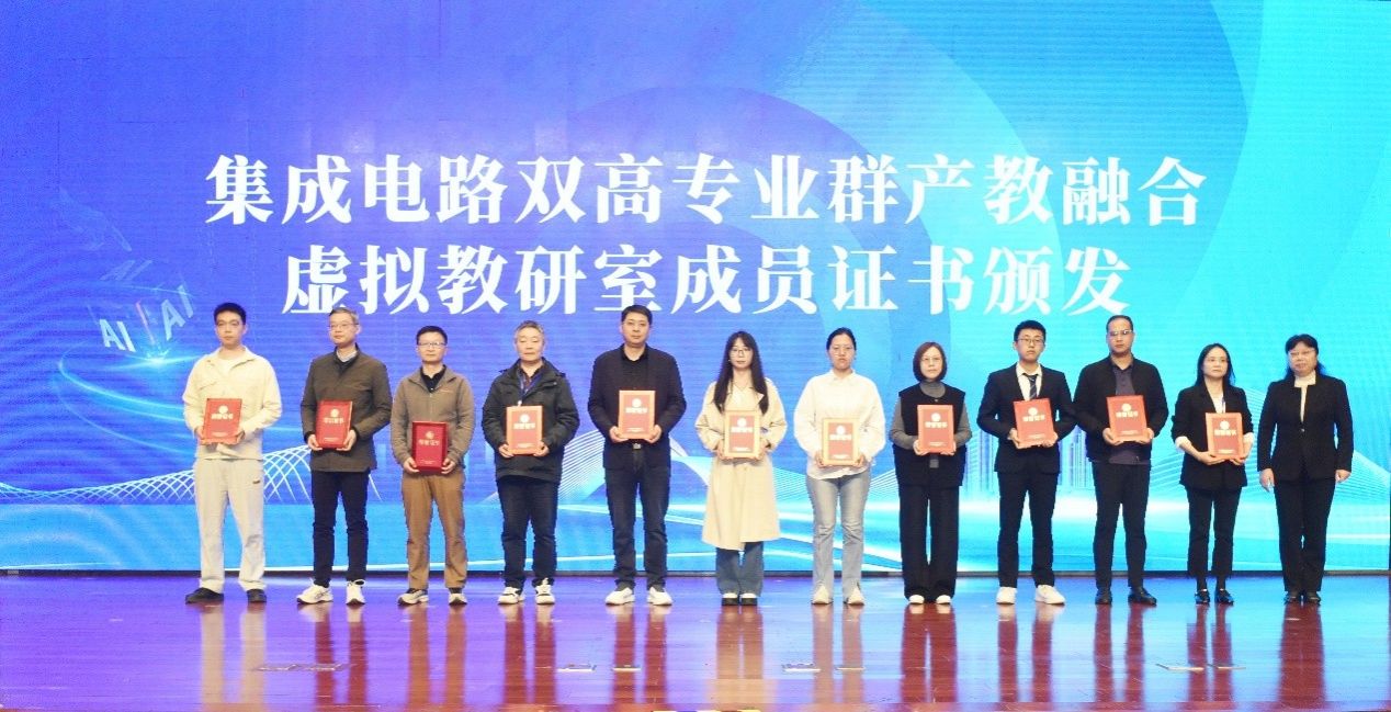 在产教融合平台建设环节,林涛教授作为集成电路双高专业群建设单位代表,上台领取“集成电路双高专业群产教融合虚拟教研室成员证书”,进一步凸显重庆电子科技职业大学集成电路双高专业群在虚拟教研领域的示范作用。