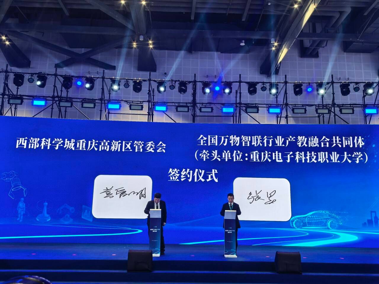 2025年11月27日,首届新型工业化产教融合展于中国重庆科学会堂隆重举行,本次展会以“智·聚英才 融·创未来”为主题,旨在探索和展示"产、学、研、用"一体化的最新成果与未来方向。在开幕式上,作为全国万物智联行业产教融合共同体牵头单位,重庆电子科技职业大学与西部科学城重庆高新区管委会正式签署战略合作协议,我校黄爱明副校长代表出席。本次签约标志着双方将在更高层次、更广领域内展开深度合作,共同为区域乃至全国科技创新与产业升级注入新的活力。