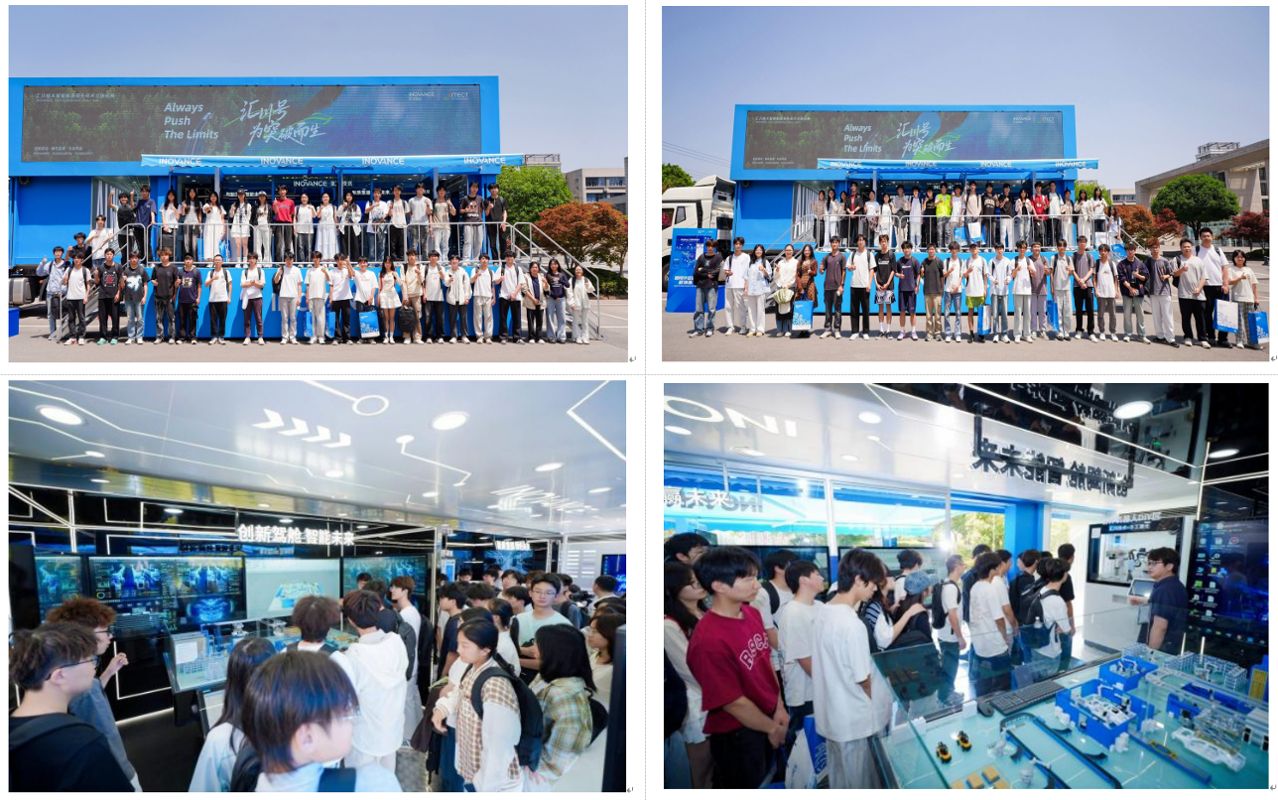 活动特别为汇智班学生设置沉浸式行业体验环节。专题分享结束后,同学们在汇川工程师引导下参观停靠在会场旁的 “汇川号” 智能制造巡展车,深入还原工业真实场景的展示空间,亲手体验汇川前沿设备与一体化解决方案,直观感受课堂知识与产业应用的结合点。参观过程中,工程师全程陪同,结合真实案例拆解技术原理、分享一线项目经验,现场解答同学们关于嵌入式与工业控制领域的技术应用、行业趋势、岗位能力要求等疑问,让刚组建的汇智班学生全方位了解汇川技术,完成了一次生动的行业启蒙。